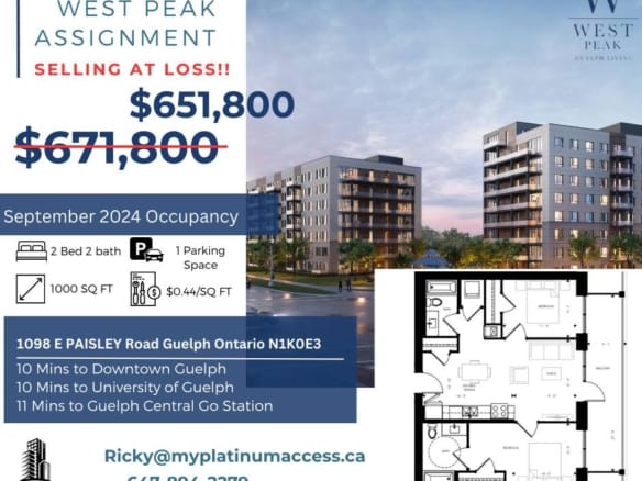 2 Bed 2 Bath | 898 Sq.Ft | Parking Included | Assignment Sale in West Peak Condos in Guelph